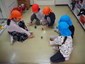 園庭ではめんこ、まりつきを行いました。5歳児ひまわり組が小さいクラスをお世話する