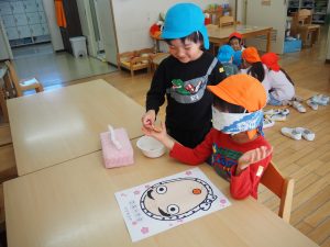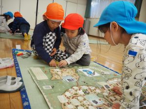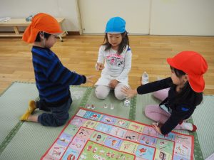 3,4,5歳児の縦割りのグループになり、カルタ、福笑い、すごろく、こま、